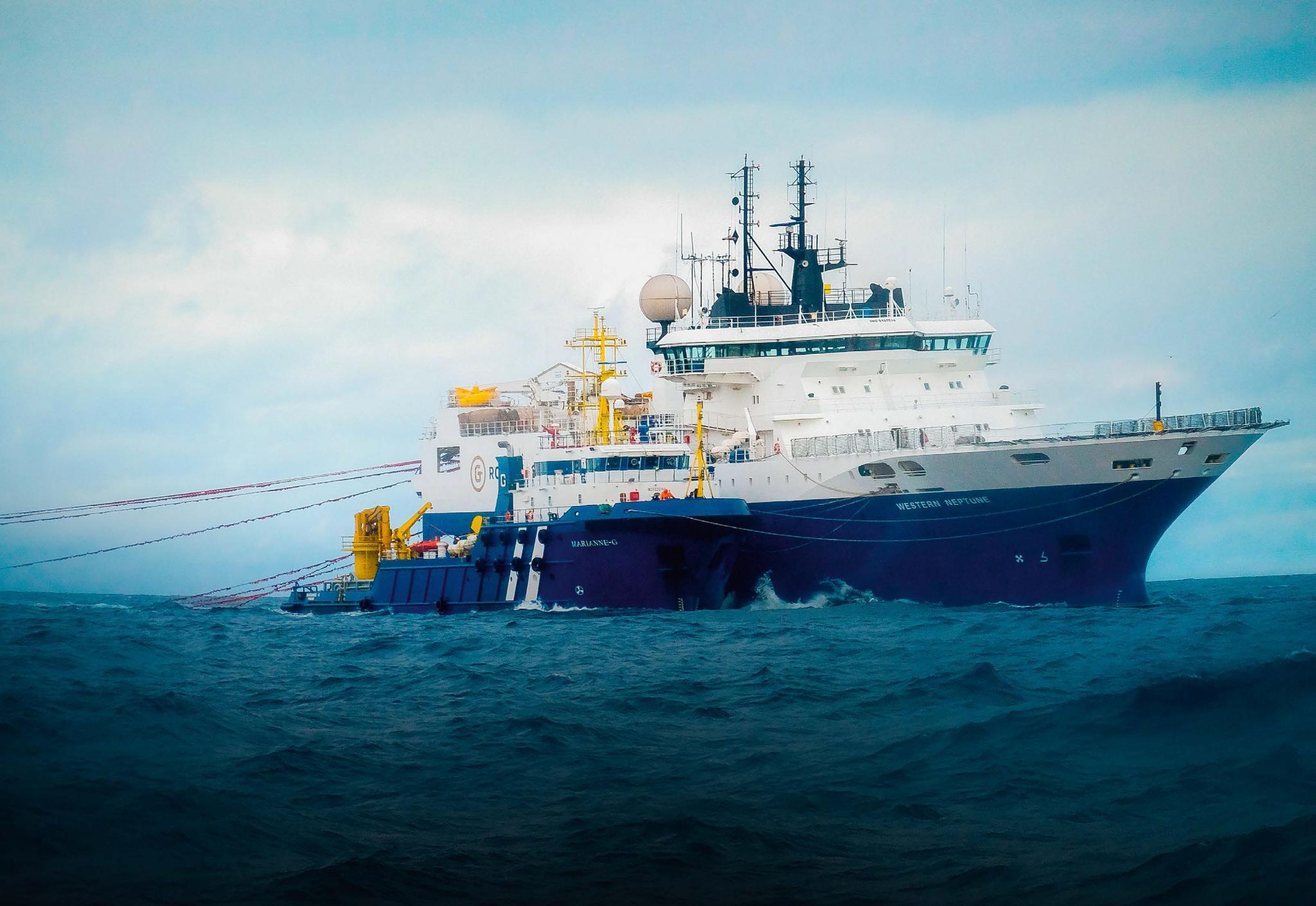 Сейсморазведочное судно Western Neptune, построенное в конце 90-х, вело работы по всему миру в интересах своего владельца WesternGeco и недавно было приобретено компанией «Севморнефтегеофизика» (СМНГ), входящей в холдинг «Росгеология». Это самый современный корабль такого типа, находящийся в собственности российской организации. Его функция – сейсморазведочная 3D-съемка. В данном случае речь идет о геологоразведке на шельфе в зоне хозяйственной деятельности РФ. Как это происходит? За кормой «Нептуна», двигающегося непрерывно и с постоянной скоростью, тянутся, уходя в воду, шесть шлангов длиной по 600 м каждый. По шлангам на пневмоисточники, или, как их тут называют, пушки, под высоким давлением подается воздух. С прецизионной синхронностью через определенный промежуток времени «пушки» выстреливают сжатым воздухом и создают звуковую волну, которая, пронизывая воду, уходит в толщу дна. На своем пути волна встречает границы между геологическими слоями разных плотностей. Наткнувшись на границу, она частично от нее отражается, а частично проникает дальше, при этом преломляясь. Затем она встречает новую границу, и все повторяется. Отражения волны от разных слоев попадают на чувствительные гидрофоны, закрепленные на так называемых сейсмокосах. Косы – наполненные гелем погружаемые в воду зонды – буксируются на глубине 8 м за кораблем, только длина их не 600, а 6000 м. Сейчас у «Нептуна» таких кос 12 (хотя он рассчитан на 16). Поскольку эхо с разных глубин приходит не одновременно,