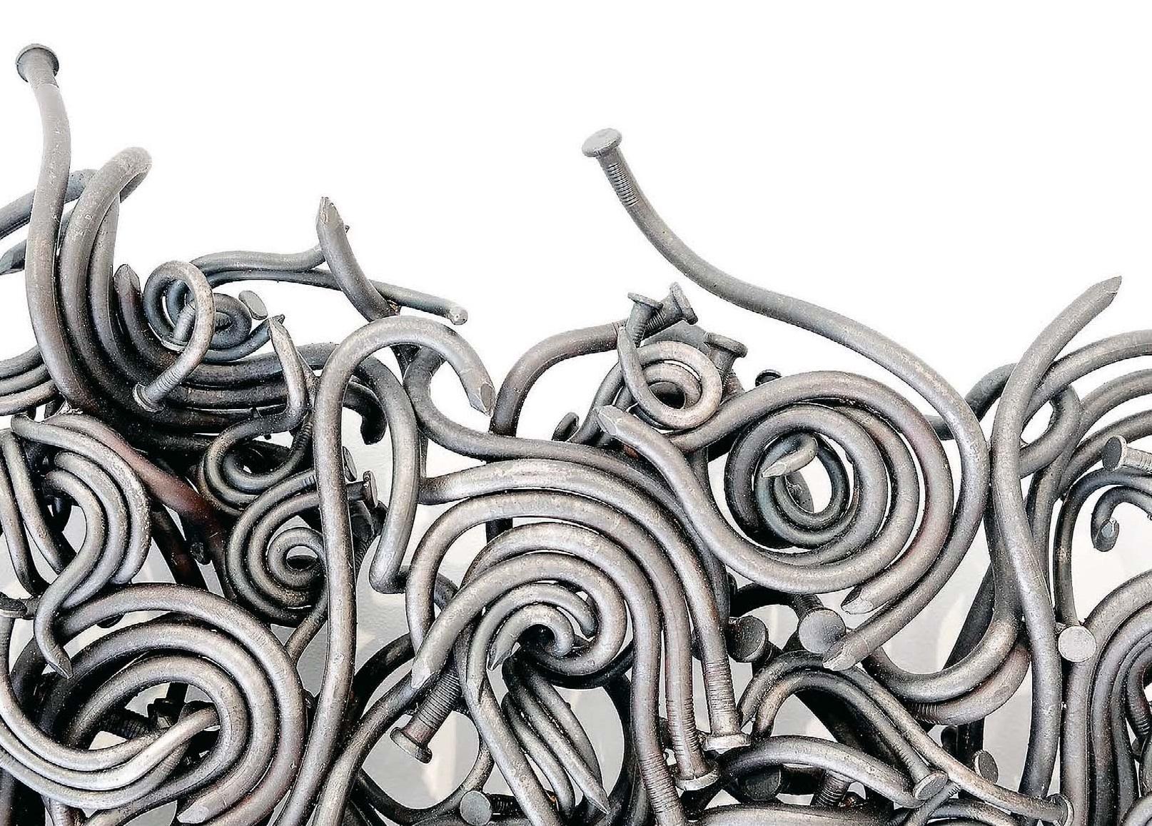 «Гвозди – это предметы, скрепляющие разные сущности», – говорил герой романа, и Джон Бисби вторит ему: «Гвозди – древнейший соединительный материал». Уверенной рукой художник сплетает их, кует, сваривает и тысячами связывает в узоры, похожие на легкую, подвижную и живую материю, зафиксированную в трехмерном стоп-кадре.