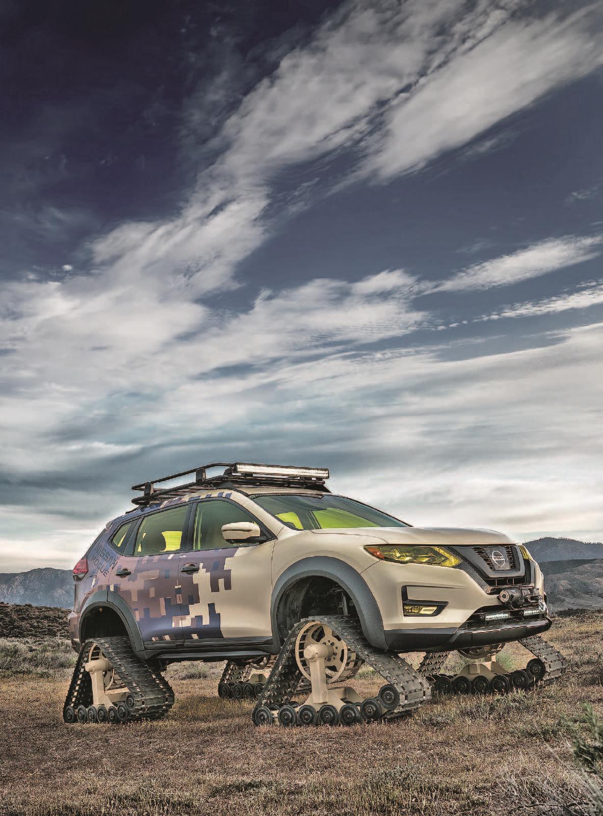 По сути ничего нового, но смотрится все равно круто! Несколько лет назад компания Nissan уже устанавливала гусеницы на свою модель Juke. В этом году в качестве шоу-стоппера для своей экспозиции на Нью-Йоркском автосалоне японские автостроители выбрали Nissan Rogue Warrior Project. Nissan Rogue – это серийный внедорожник, известный в России как X-Trail третьего поколения. Чтобы превратить его в Warrior Project, конструкторы Nissan ограничились установкой
