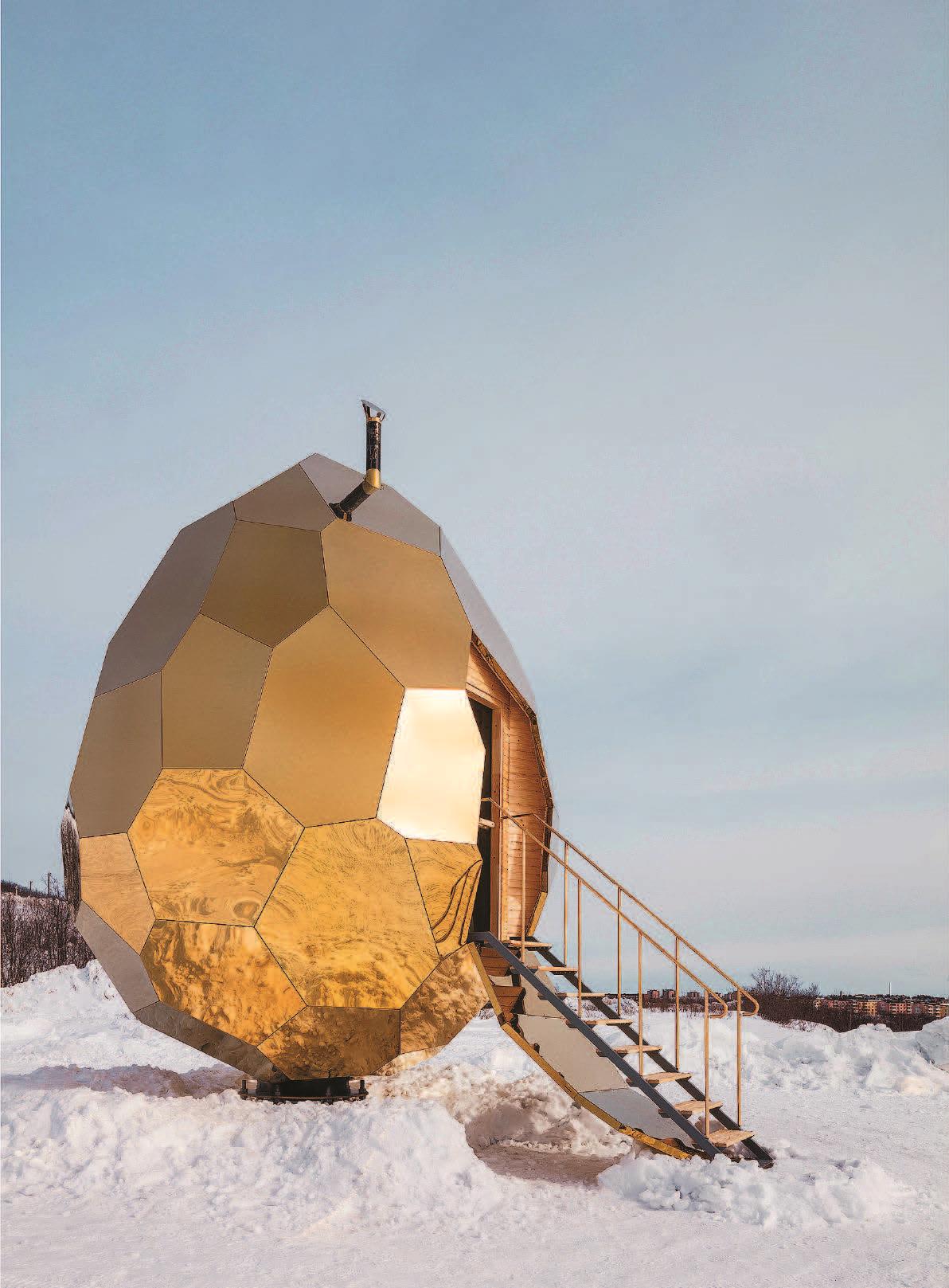 Фото, на котором золотое граненое яйцо стоит среди заснеженной тундры, похоже на первый кадр космического ужастика про в который раз свалившуюся на Землю инопланетную нечисть. Видимо, такого эффекта и добивались авторы этого арт-объекта из шведского дизайн-бюро Studio Bigert & Bergström, хотя внутри расположена всего лишь старая добрая сауна, построенная из деревянных панелей. Светодиодное освещение бани питается от электробатарей, но тепло дают обыкновенные дрова, сгорающие в железно-каменной печи – она имеет, кстати, довольно вычурный дизайн. «Золотое яйцо» установлено неподалеку от главной достопримечательности шведской Лапландии – Ледяного отеля. И если кому-то из созерцателей зимних красот вздумается как следует погреться – вход свободный, надо заплатить лишь за банные принадлежности.