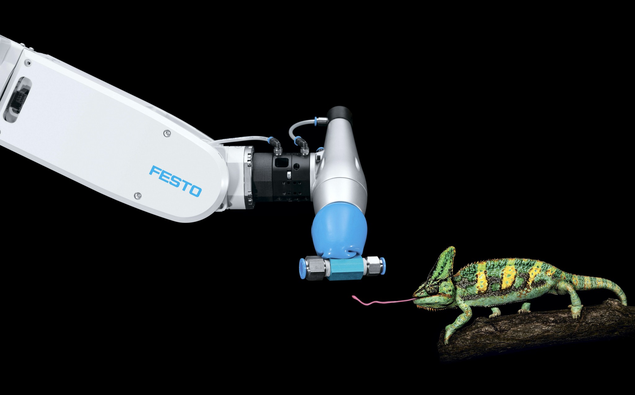 Компания Festo, основанная в Германии, поначалу занималась производством деревообрабатывающих станков, но начиная с 2006 года в ней появилось подразделение, проектирующее и строящее роботов. Причем основным направлением творческого поиска конструкторов стала бионика – подражание природе, поиск удачных инженерных решений, работающих в живых организмах. Специально для этого компания создала Bionic Learning Network – научную сеть, объединяющую несколько университетов и научных учреждений, занятых схожей проблематикой. В разработках компании Festo фигурируют хватающие роботизированные механизмы, основанные, например, на локомоторике рыбьего хвостового плавника или языка хамелеона (как на фотографии). В некоторых изделиях задействованы также принципы движения паука или слоновьего хобота.