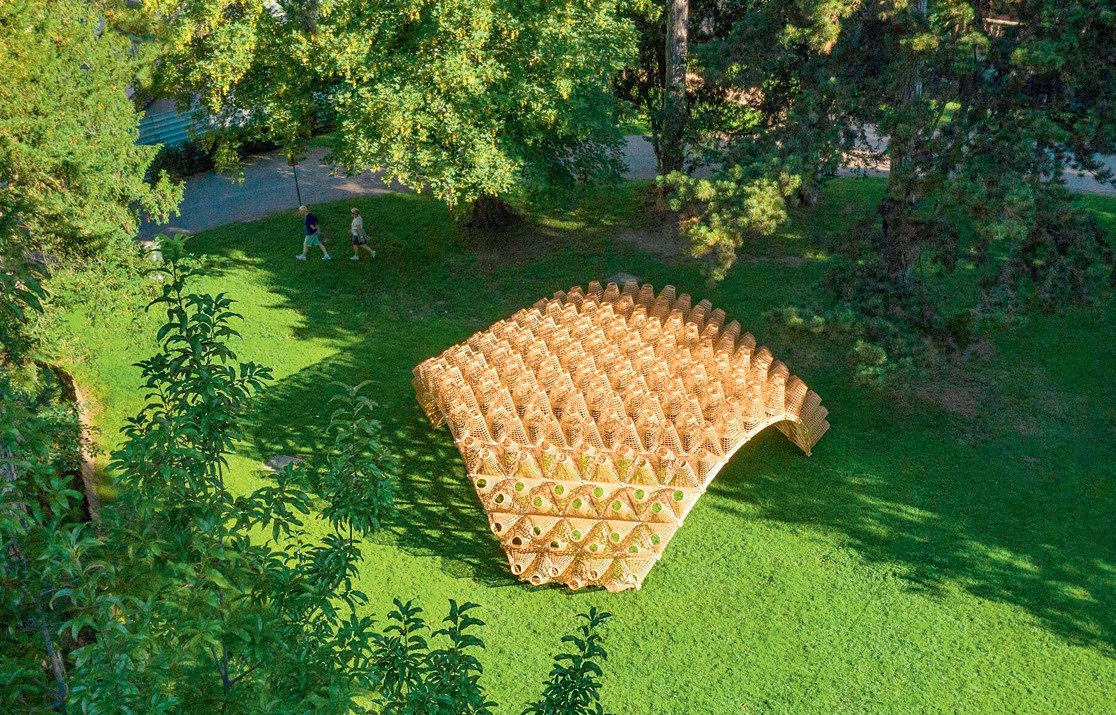 ПЛЕТЕНЫЙ ПАВИЛЬОН (The Wicker Pavillion) был представлен латвийским архитектурным бюро DJA на ландшафтном фестивале Annecy Paysages во французском городе Анси. По замыслу дизайнеров, инсталляция должна символизировать единство современных архитектурных технологий и традиций сельского ремесла. Ажурный облик строению придают несущая структура из сосновых досок, соединенных как сеть геокупола, и установленные сверху корзины, созданные руками латышских