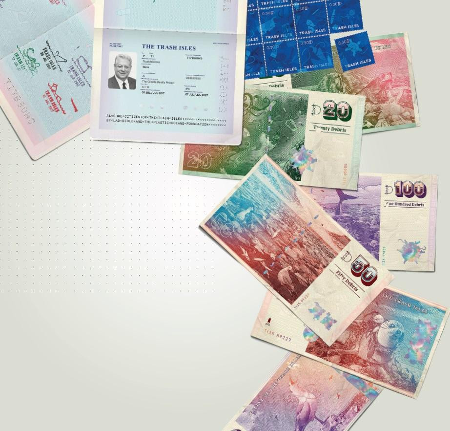 Родина начинается с паспорта, собственной валюты и символики – во всяком случае именно с этого начали Майкл Хьюз и Даль-Эванс де Альмейда, провозгласившие образование нового государства. Уже готовы оригинальные штампы для виз, банкноты, почтовые марки и герб, на котором черепаха запуталась в обрывке троса, а хвост кита поднимается между мусорными островами.