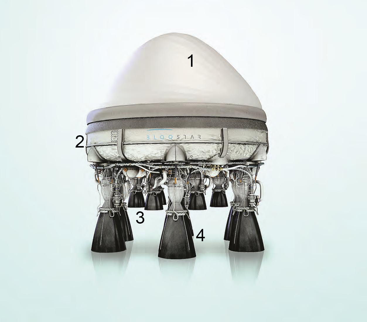 Первая ступень с шестью жидкостными реактивными двигателями тягой по 15 кН должна отделяться от стратостата на высоте порядка 30 км.