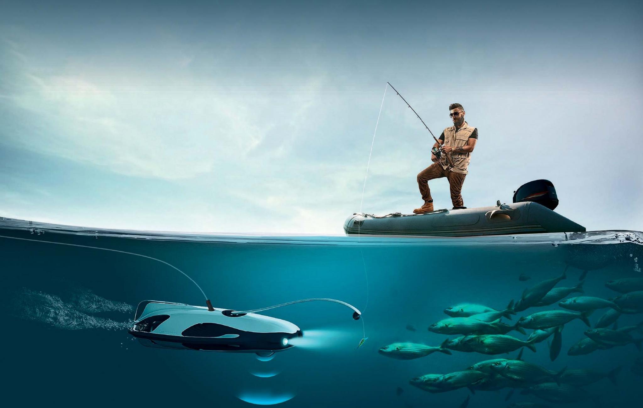 На счету китайской компании Powervision уже несколько проектов, которые привлекли внимание всего мира, включая дроны PowerBee для проведения воздушных световых шоу и летающее «робояйцо» RoboEgg. С недавних пор семейство пополнилось беспилотным аппаратом для рыбалки PowerRay. «Роборыбак» регистрирует температуру воды, глубину погружения, передает данные о рельефе дна и обнаруженной рыбе на мобильное приложение для iOS/Android. Для этого на борту имеется портативный эхолот Fishfinder, который может отсоединяться и использоваться отдельно. Но главное – кончик лески с крючком скользящим узлом прикрепляется к специальному удилищу, размещенному на роботе. Тут же имеются видеокамера и беспроводной интерфейс WiFi, поддерживающий трансляцию видеопотока с разрешением 1080 р на расстояние до 80 м – в том числе и для устройств виртуальной реальности. Яркие синие светодиоды помогут приманить рыбу и вести съемку всего процесса, пока та окончательно не попадется на крючок.
