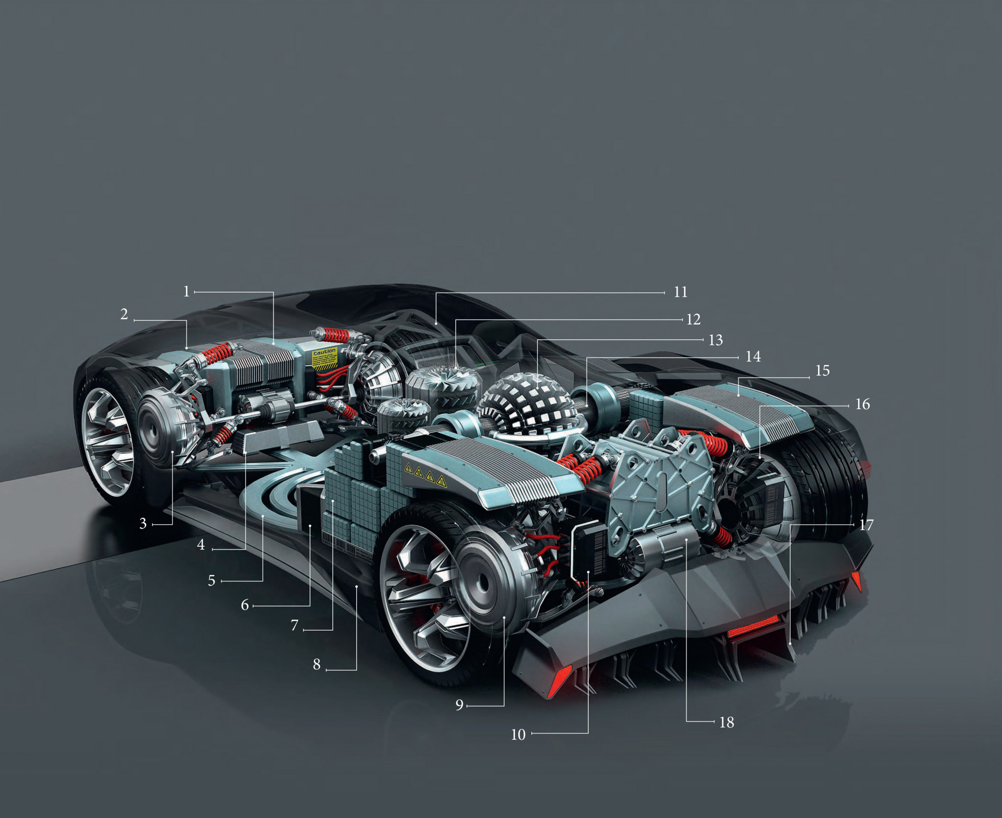 На небольшие расстояния автомобиль передвигается на аккумуляторах, на помощь которым приходят четыре маховика K.E.R.S., встроенные в каждое колесо. Они раскручиваются во время движения и могут отдавать энергию при торможении. В днище располагаются баллоны с жидкостью, которая в газообразном агрегатном состоянии раскручивает турбины, вращающие генератор. Сам термоядерный реактор запускается по необходимости.