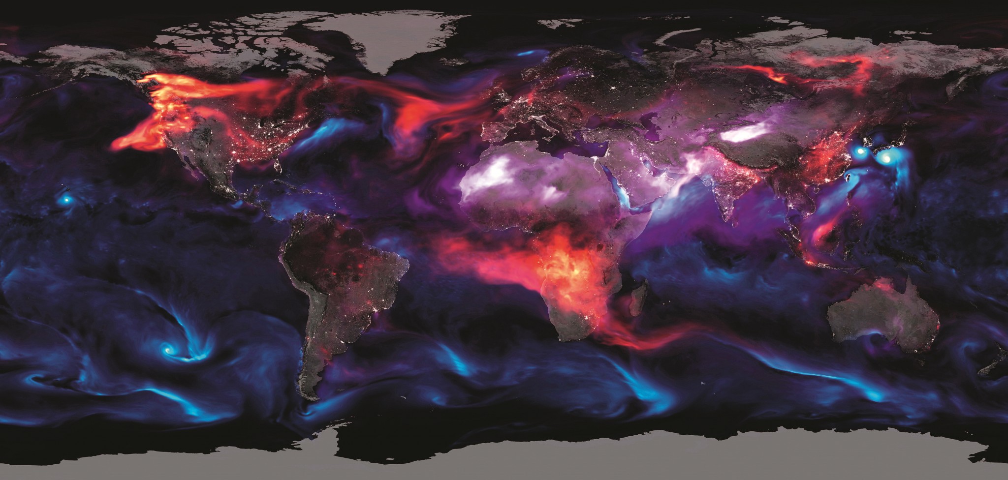Так выглядела наша планета одной вполне обыкновенной ночью на исходе лета 2018 года. Картина получена с помощью климатической модели Geos FP, которая способна анализировать данные наземных и спутниковых метеонаблюдений, обобщать их и делать выводы о состоянии и поведении атмосферы.