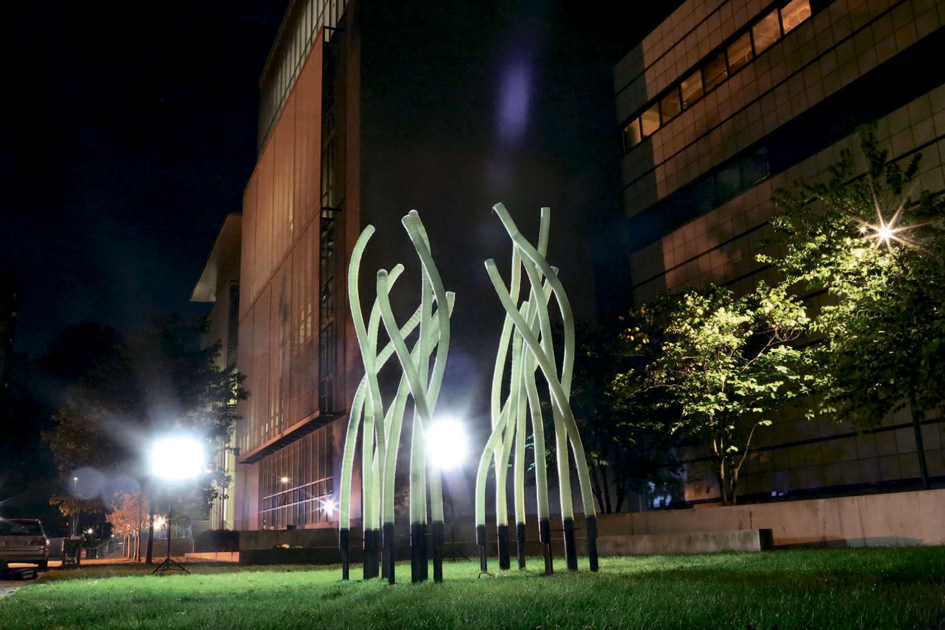 Это не инопланетное вторжение и даже не художественная инсталляция, а кое-что получше: полые трубки, сплетенные из стекловолокна, – возможный прообраз будущих поселений на Луне и Марсе. Гибкое и прочное стекловолокно химически инертно, стойко к значительным перепадам температур, и миниатюрные роботы Fiberbot позволяют возводить из него сложные трубчатые конструкции. Точнее говоря, сплетать: каждый такой аппарат несет катушку волокна и, подцепив нить, накручивает ее вокруг своего цилиндрического тела, после чего слегка сдувается и переползает дальше, продолжая свою паучью работу. Различные варианты плетения позволяют варьировать толщину и механические свойства готовой трубы. Кроме того, Fiberbot способны работать «бригадами», координируя свои действия. Продемонстрированная разработчиками конструкция была создана 22 роботами за 12 часов работы и простояла на улице больше семи месяцев без каких-либо разрушений. Это, конечно, еще не Марс, но уже кое-что.