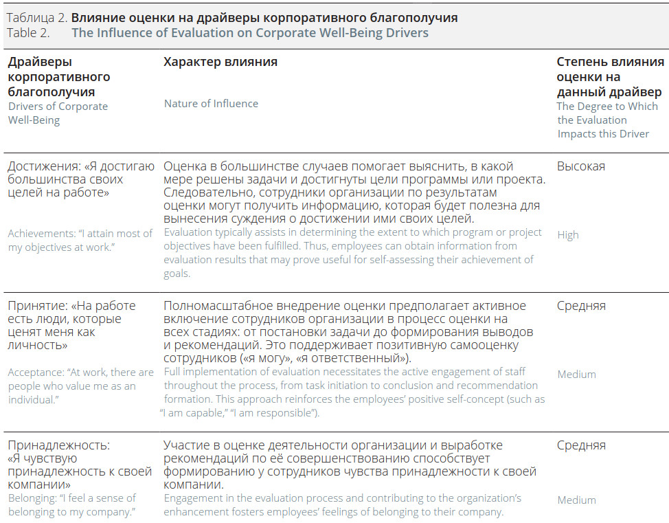 Наш опыт свидетельствует о том, что полномасштабное внедрение оценки в деятельность НКО может позитивно влиять на благополучие сотрудников. Наиболее вероятно проявление такого влияния на следующие составляющие благополучия: достижения («я достигаю большинства своих целей на работе»), социальная значимость («моя работа важна для решения социально значимой задачи»), обучение («я постоянно чему-то учусь на работе»).