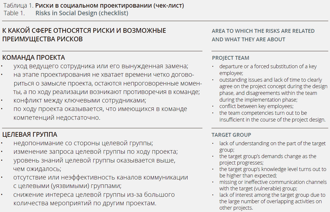 Publications on risk management (Vyatkin, 2018; Dmitrieva, 2022; Korabeinikov, 2019; Fisun, 2018) and project risk management (Korolkova, 2013; Shkurko, 2014) are available to anyone interested in these issues. Numerous articles and books on risk management have been written in Russian to date; the above are just a few examples. At the same time, risk assessment and risk management in social design receive much less coverage, even though they are a highly relevant topic1.