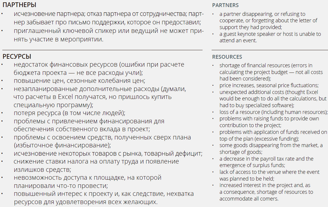 В данном случае каждый риск — это реальная проблема, с которой сталкивались на практике представители российских НКО. Следовательно, можно исходить из того, что такое может случиться и у вас. Поэтому, когда ваш проект будет разработан, можно пройтись по всему списку и ответить на следующие вопросы: