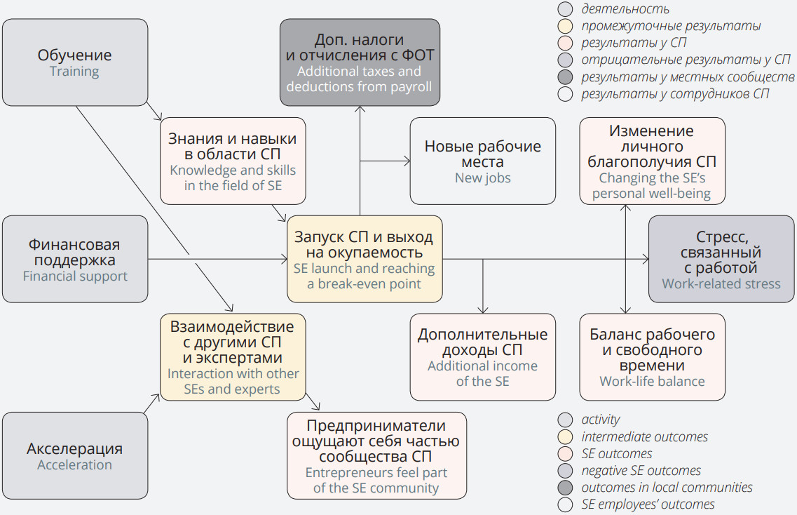 Since social entrepreneurs are the main target audience of the Start Your Own Business program, it was decided to focus on them, while taking into account purely economic outcomes (in the form of tax deductions by SE and income of their employees) for other stakeholder groups in the SROI calculation. This decision is consistent with the first principle of SROI, to involve stakeholders, and the fifth, not to over-claim: since neither the SE staff nor the local communities were actually available to researchers, only those outcomes that could be established without their direct involvement were taken into account for them.
