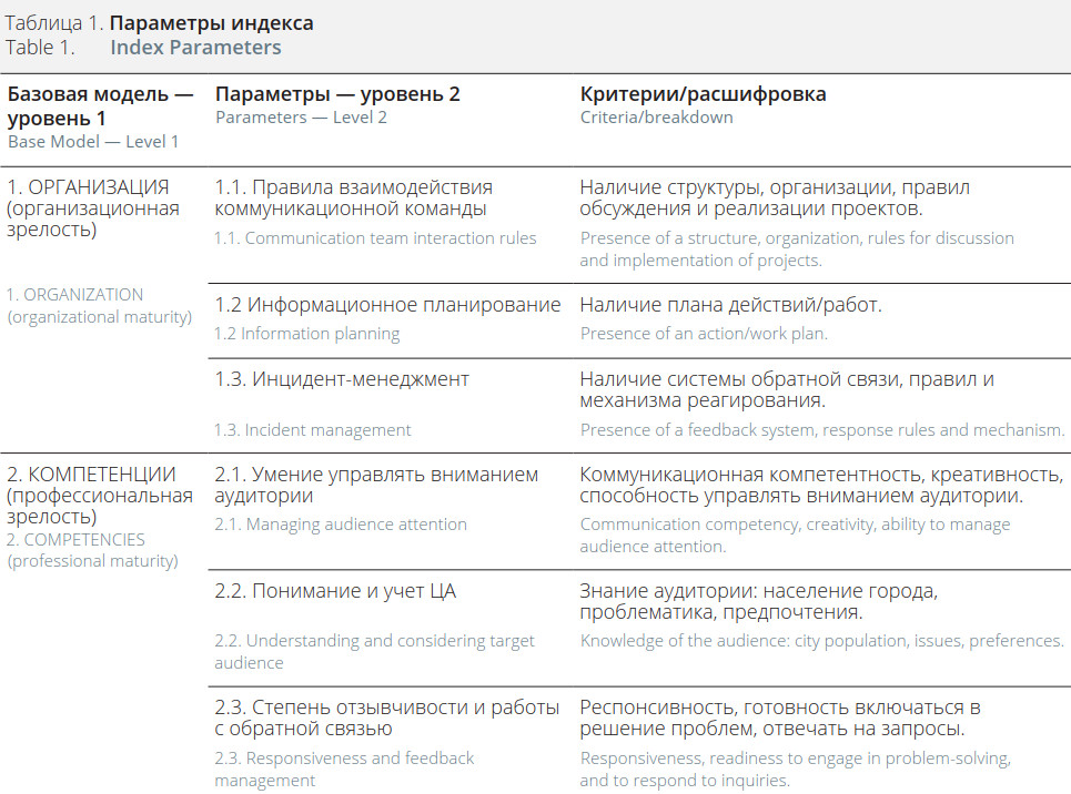 Индекс коммуникационной состоятельности строится на основе 12 параметров, сгруппированных в 4 направлениях (Таблица 1).