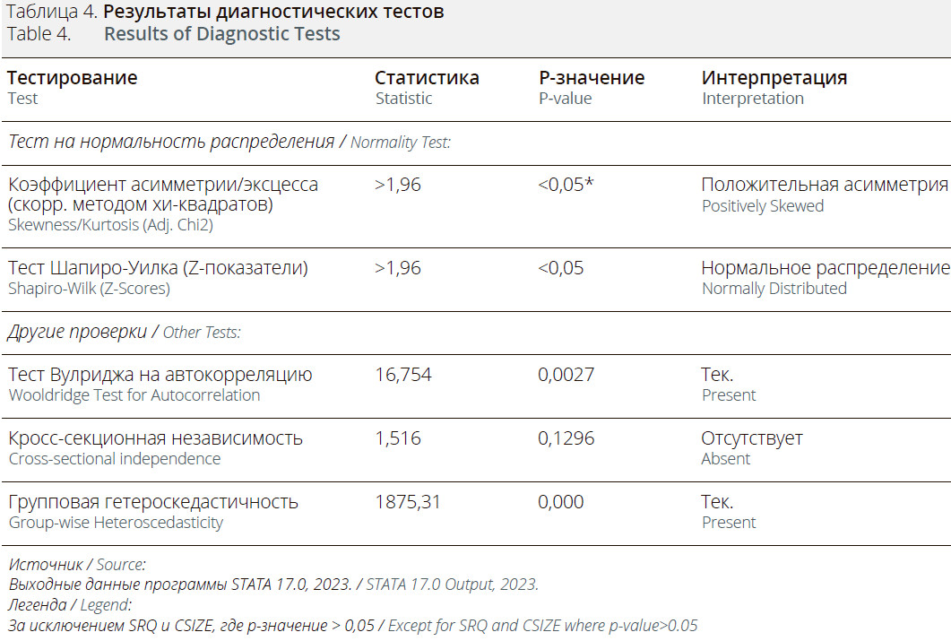 Кроме того, были проведены тесты на нормальность распределения (проверка асимметрии и эксцесса, тест Шапиро-Уилка), тесты Лагранжа и Бреуша-Пагана, одновременную корреляцию, панельную последовательную корреляцию и групповую гетероскедастичность. В Таблице 4 представлен обзор результатов этих тестов.