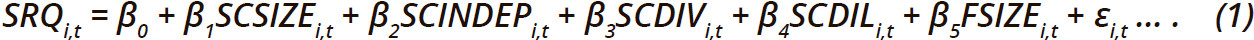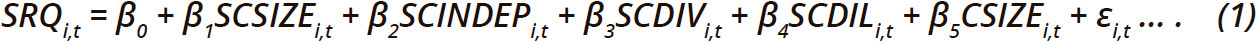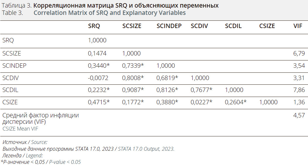 В Таблицах 2 и 3 представлена описательная и корреляционная статистика соответственно, для переменных, изучаемых в данном исследовании: SRQ, SCSIZE, SCINDEP, SCDIV, SCDIL и CSIZE.