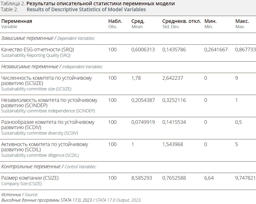 Исходной переменной исследования является качество ESG-отчетности (SRQ). Показателем служит индекс раскрытия информации об экологических, социальных и управленческих аспектах, описанный в руководстве по отчетности GRI (версия G4) (Global Reporting Initiative, 2013). При этом независимой переменной являются характеристики комитета по устойчивому развитию (численность, независимость, разнообразие и активность). Численность комитета по устойчивому развитию (SCSIZE) определяется как общее количество членов комитета по устойчивому развитию (Maroun & Nasr, 2018); независимость комитета по устойчивому развитию (SCINDEP) рассчитывается как количество независимых директоров в комитете по устойчивому развитию, деленное на общее количество членов (Cho, Lee & Pae, 2020); разнообразие комитета по устойчивому развитию (SCDIV) выражается в отношении количества женщин к общему количеству членов комитета по устойчивому развитию (Orlitzky, Rynes & Gardberg, 2017); а активность работы комитета по устойчивому развитию (SCDIL) отражается в частоте проведения заседаний комитета в год (Global Reporting Initiative, 2015; Sustainalytics, 2021). Таким образом, при анализе влияния характеристик комитета по устойчивому развитию на качество отчетности банков, попавших в выборку, в исследовании контролируется влияние размера компании (выражаемого как логарифм совокупных активов) на SRQ. Причина контроля размера компании заключается в том, что в зависимости от ситуации, более крупные организации могут обладать большими ресурсами и структурной сложностью, что может повлиять на их способность решать вопросы устойчивого развития и отчитываться по ним.