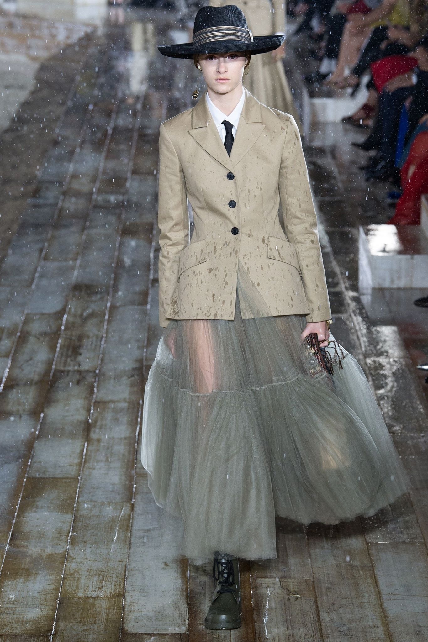 Каждую новую коллекцию Мария Грация Кьюри связывает с историей. Так, на этот раз ее вдохновением стали женщины-гонщицы на родео из Мексики, прозванные эскарамуза. Яркий пример new look`а в годы мексиканской войны за независимость - костюм, состоящий из куртки, надетой поверх очень объемной юбки, и тонкие, но блестящие украшения.