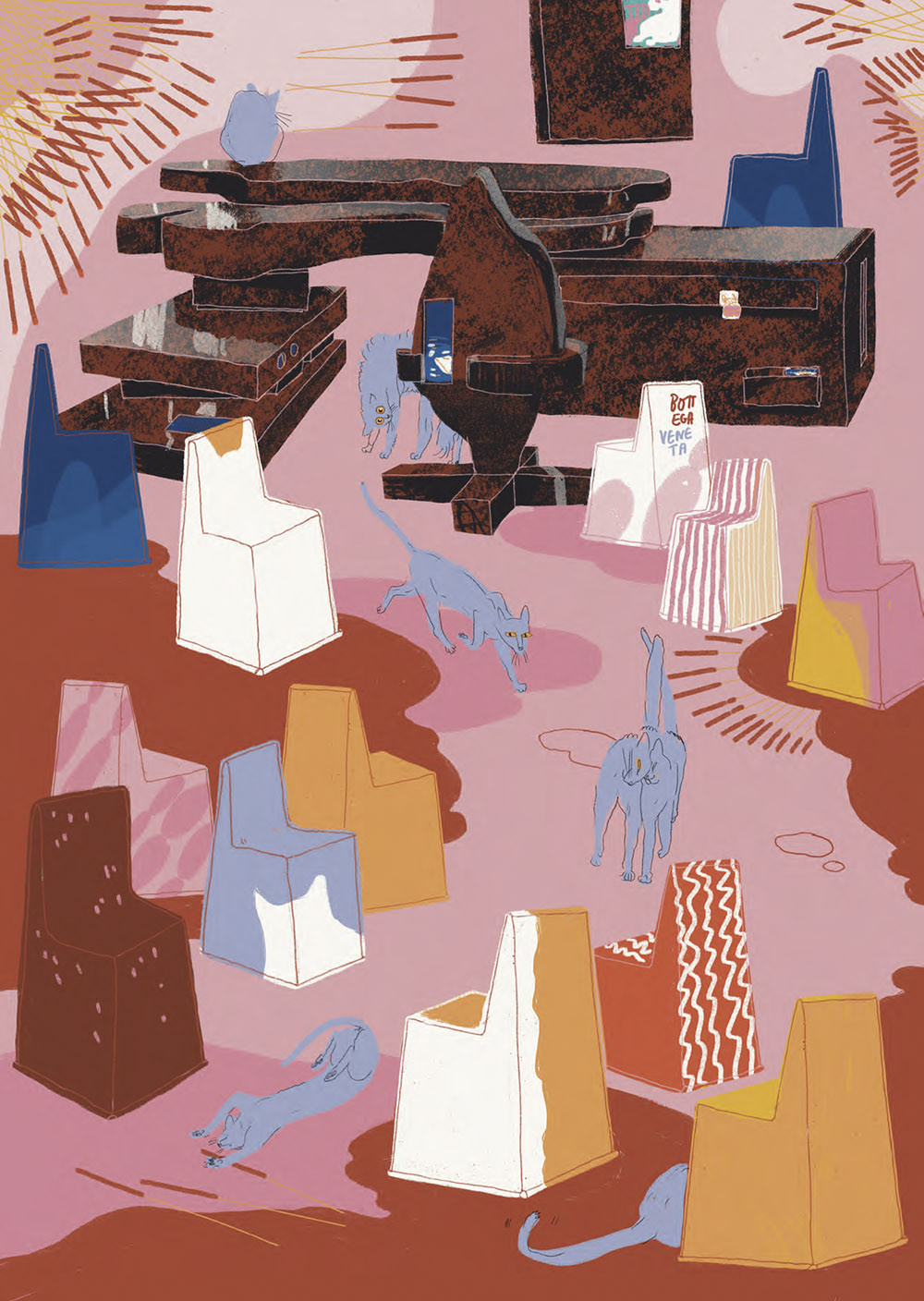 Безусловным маркером остается индустрия моды, которая всегда умела подхватывать горячие мировые тренды и использовать их в своих маркетинговых целях. Сотрудничество брендов-гигантов с дизайнерами стало такой же нормой, как в свое время бесчисленные коллаборации с художниками, а затем и с архитекторами. Мои любимые примеры последних таких взаимодействий – стол-бюро дизайнера Laurids Gallee и Dolce & Gabbana, стулья Гаэтано Пеше для показа Bottega Veneta и инсталляция коллектива We Make Carpets и Issey Miyake.