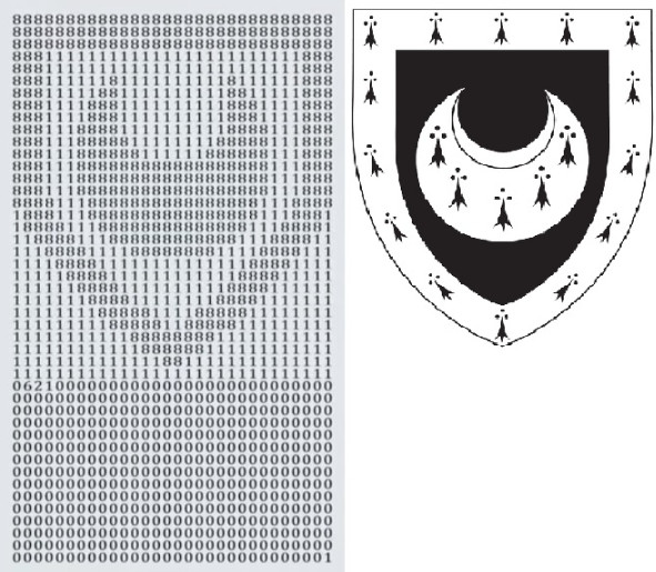 Самый знаменитый (и, видимо, самый первый) пример такой картины — это простое число, изображающее герб Тринити Холла, одного из старейших колледжей Кембриджа, среди выпускников которого, например, Стивен Хокинг. Его в свое время обнаружил математик Джеймс Макки (James McKee), оно состоит из 1350 цифр (это год основания колледжа), и выглядит вот так.