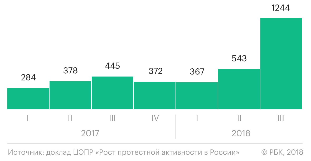 В течение года — с начала октября 2017 года по конец сентября 2018-го — произошел резкий рост протестной активности населения. К такому выводу пришли эксперты Центра экономических и политических реформ (ЦЭПР) в докладе «Рост протестной активности в России». Его авторы подсчитали количество и проанализировали темы и другие характеристики протестных акций за 2017 и 2018 годы (до 1 октября).
