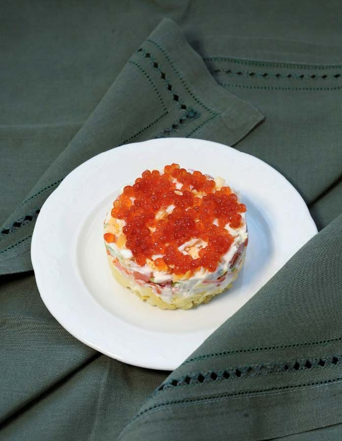 Во времена СССР роль рябчиков исполняла колбаса, раковые шейки стали морковкой. Мы же предлагаем приготовить оливье в форме тортика с икрой