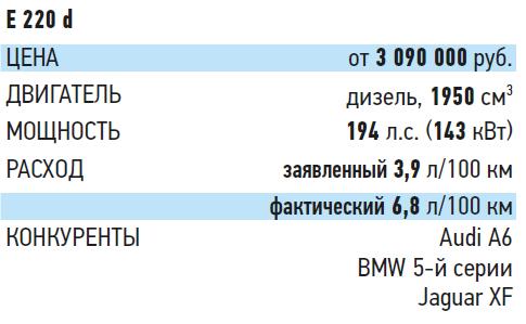 В плане расхода новый 220 d вообще радует: если в городе немалая масса – 1900 кг – показать выдающихся результатов не позволяет (в нашем испытательном цикле получилось 8,4 л на 100 км), то на магистрали литра дизтоплива хватило на целых 17 км (5,9 л/100 км), что для этого сегмента – рекорд. Конечно, это не только заслуга экономичного турбодизеля: свое веское слово сказала аэродинамика, которую годами оттачивают штутгартские специалисты. В этом смысле 220 d продуман тщательно: предусмотрены передний воздухозаборник с изменяемой геометрией, открывающийся и закрывающийся в зависимости от потребности двигателя в охлаждении, и еще множество решений, снижающих лобовое сопротивление. Так что полученное на нашем полигоне экспериментальным путем значение Cx=0,290, при том, что на автомобиле в спортивной комплектации стояли очень широкие шины, нас не удивило.