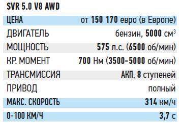 Версия SVR разгоняется с места до 100 км/ч за 3,7 с, а за 12 с – до 200 км/ч. Полный привод помогает лучше реализовать весь запас мощности и тяги (700 Нм!), а 20-дюймовые колеса обеспечивают отличный «держак» в поворотах и при торможении – система мощная, хваткая и сбалансированная, хотя педали не хватает плотности при