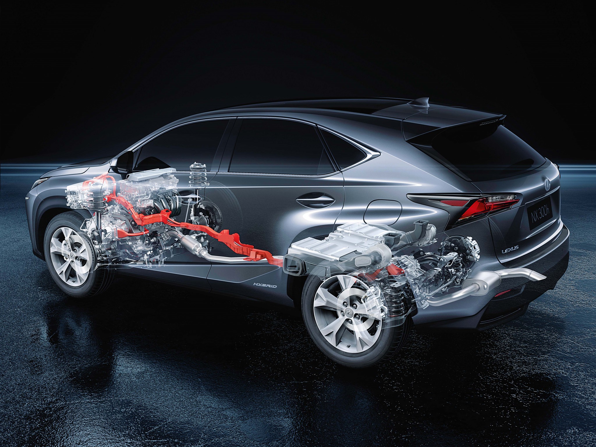 Как видно на «рентгеновском снимке» Lexus NX, механическая связь между силовой установкой (четырехцилиндровый бензиновый мотор плюс гибридный модуль) и задними колесами отсутствует. Их вращает еще один электромотор мощностью 50 кВт (68 л.с.).
