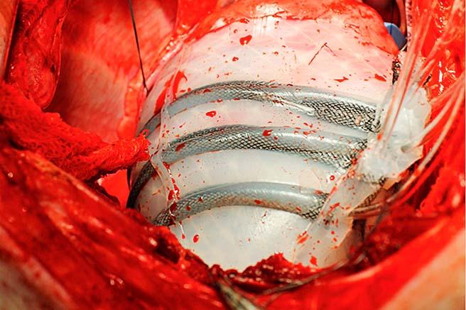 Рукав обработан специальным гелем, который гарантирует совместимость с живыми тканями, покрыт искусственными мышцами, имитирующими естественные движения сердца, и соединен специальными шлангами с внешним насосом.