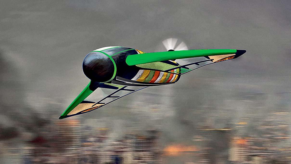 Философия Pouncer — максимальное число его элементов должны быть пригодны для употребления в пищу или для ее приготовления. Крылья инженеры Windhorse Aerospace предлагают делать из биоразлагаемого стеклопластика, в будущем, возможно, из съедобных материалов на основе крахмала. Внутреннюю полость крыльев с размахом в 3 м займет спрессованная еда, вода или при необходимости медикаменты. Каркас будет деревянным и станет основой для разжигания костра и готовки. Сейчас дроны изготавливаются в основном из композитных материалов или легкого алюминия, говорит директор ижевского ООО «Беспилотные системы» Александр Ушомирский. По его мнению, из «органики» может применяться лишь фанера.