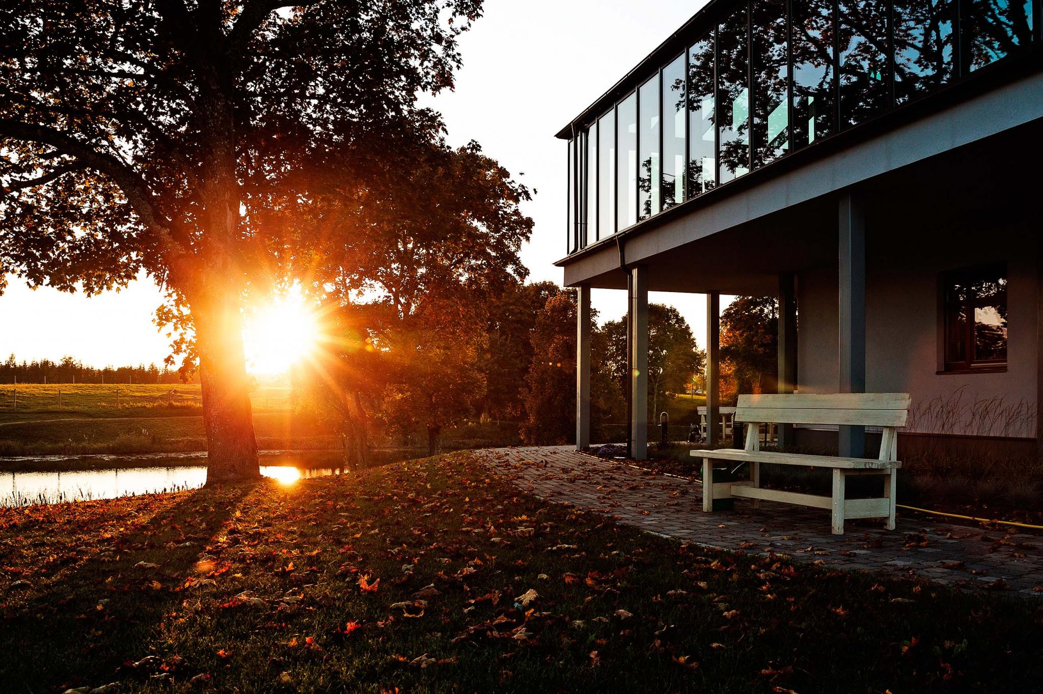 Территория площадью 180 га окружена по периметру прудами, разделенными между собой насыпными дамбами. «Так что мы находимся на острове», — говорит Александров. Здесь было два колхозных пруда, остальные вырыли сами, запустили 500 лососей, и теперь рыбалка входит в оздоровительную программу, добавляет он. От колхоза остались яблоневые сады — работники центра собирают урожай. Вокруг аккуратно подстриженные газоны, среди них вьются выложенные плиткой дорожки, ведущие к разбросанным на приличном удалении зданиям: старая и новая гостиницы, два гостевых домика, 25-метровый бассейн, спортзал, конюшня с манежем, кафе. Живописный парк: пригорки, низинки, берега прудов, аллеи и лесные заросли — все это создает атмосферу то сельской пасторали, то дорогого гольф-клуба.