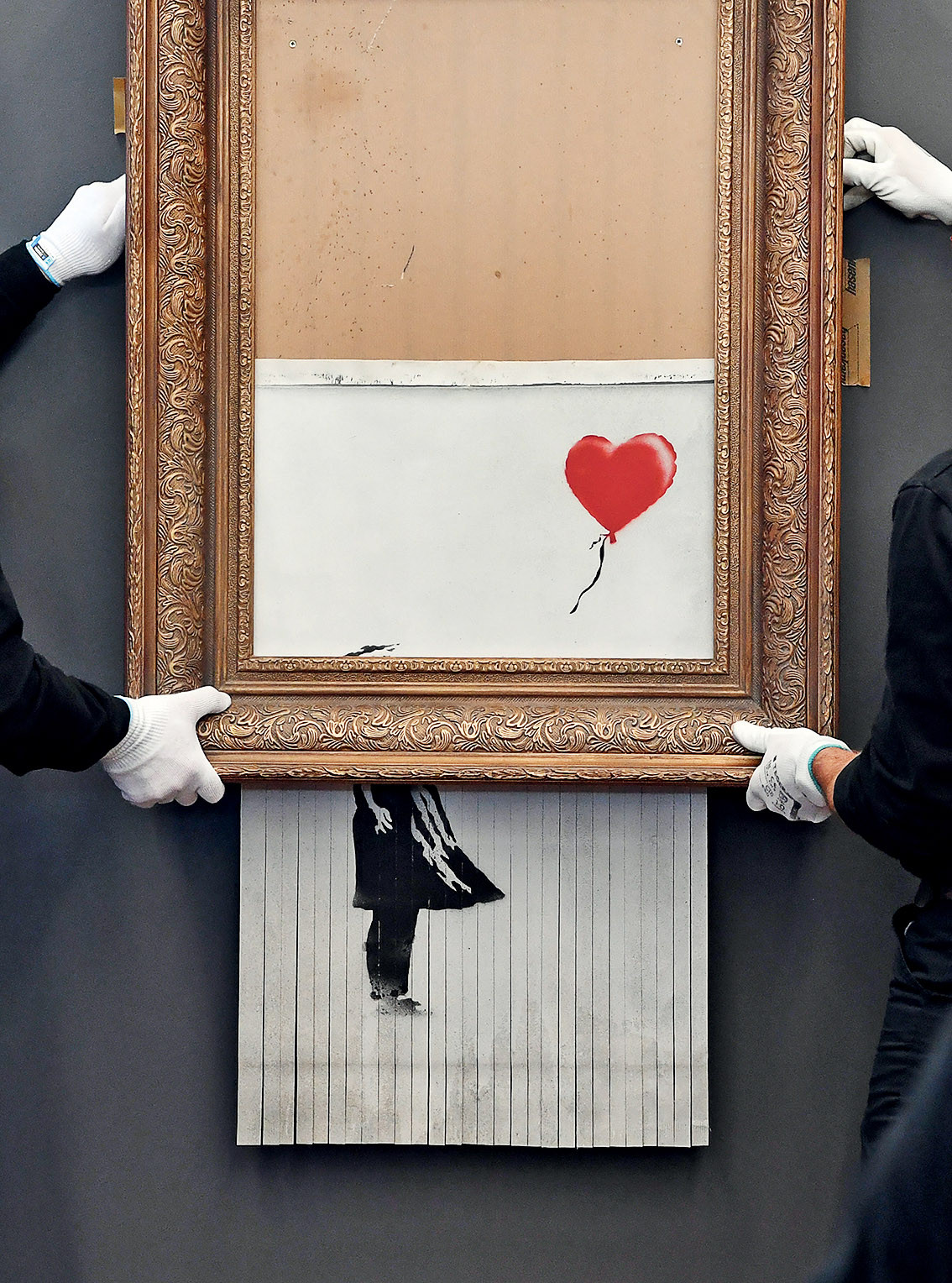 02. Измельченная картина Бэнкси была показана в музее Фридера Бурда в Баден-Бадене в 2019 году. Первоначально картина называлась Girl with Balloon («Девочка с воздушным щаром»). Поскольку произведение было уничтожено во время художественного аукциона в Лондоне, его назвали Love is in the Bin («Любовь в мусорном ведре»). Позже Бэнкси представил этот перформанс как акцию протеста против арт-рынка.