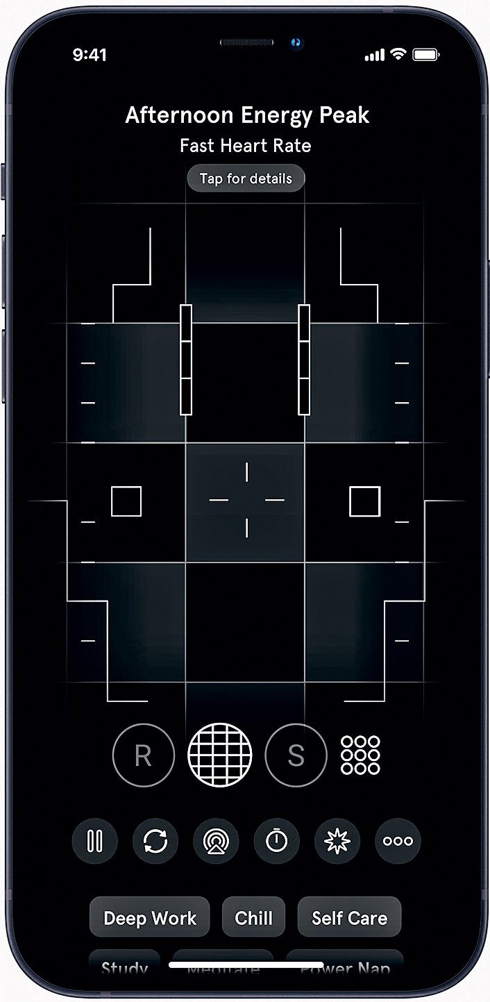 09. Интерфейс российского приложения Endel, которое собирает данные о человеке (например, частоту пульса, которую измеряют смартчасы), объединяет их с информацией о внешних факторах — времени суток, погоде за окном — и выдает персонализированный звуковой фон.