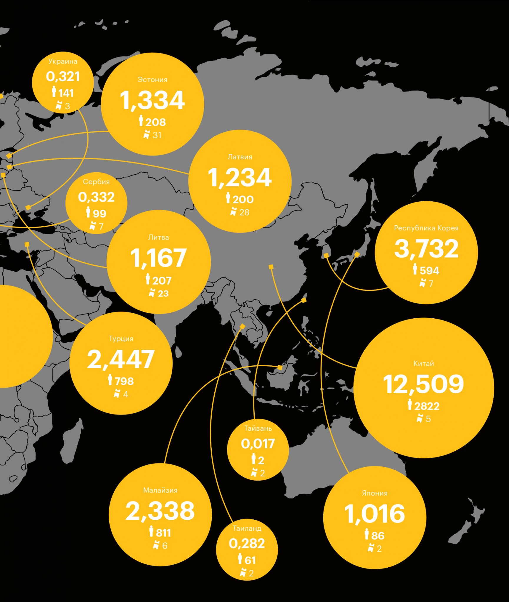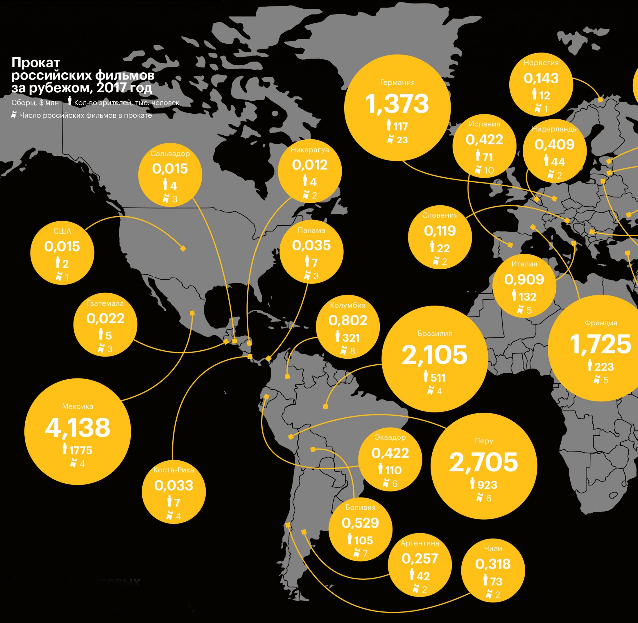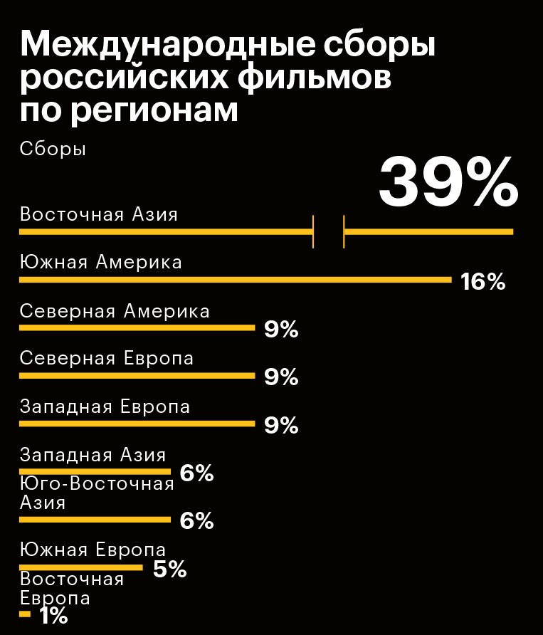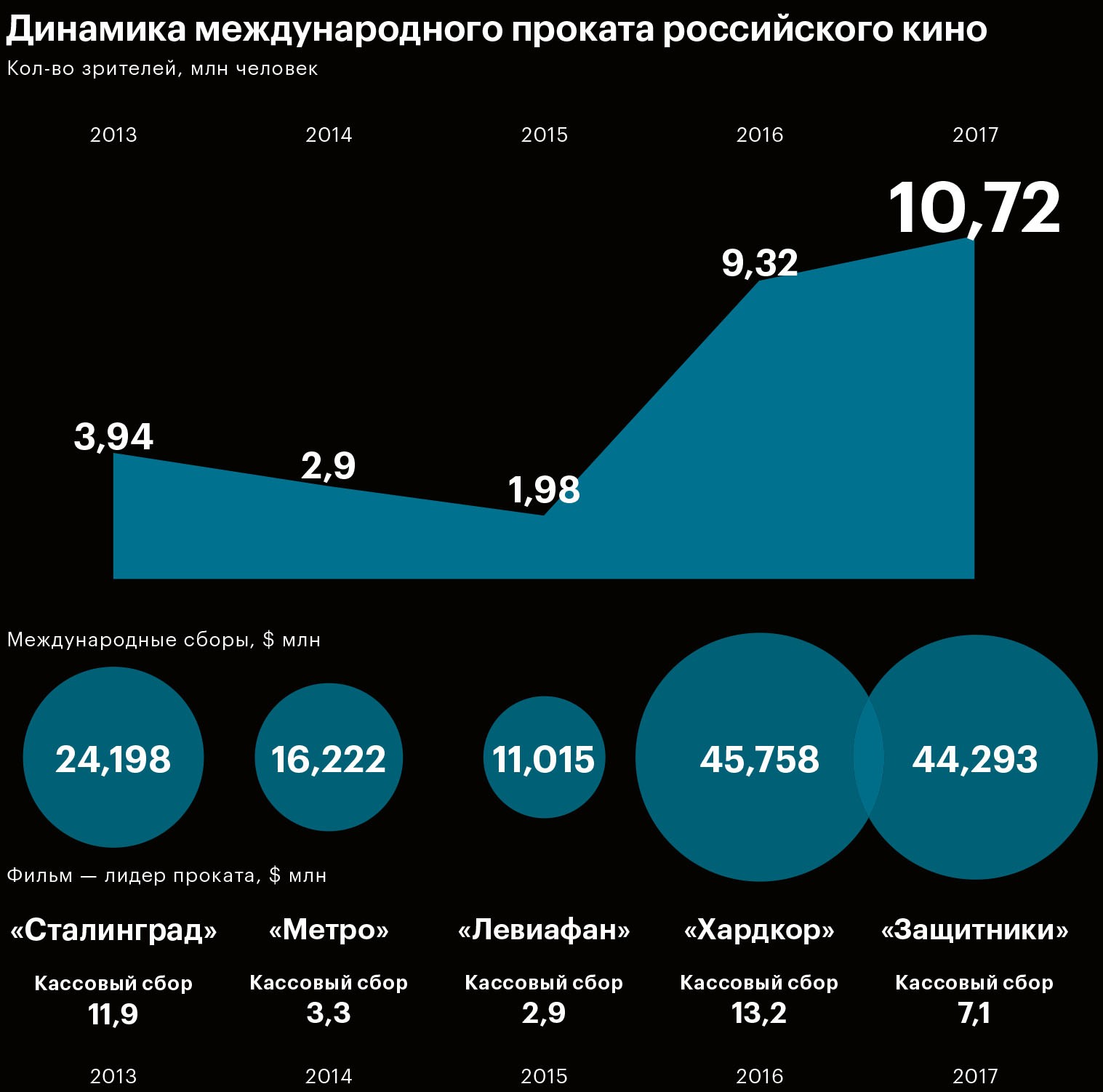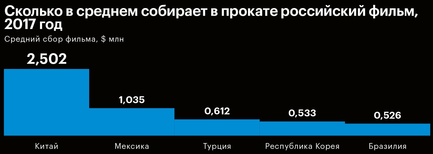Кассовые рекорды российского кино на родине в последние годы затмили еще одну важную тенденцию — востребованность отечественной кинопродукции за рубежом. Вопреки стереотипам о низком качестве продукта сборы российских фильмов в зарубежном прокате в последние два года резко выросли — в 2016-м и 2017-м совокупный боксофис последовательно брал планку в $40 млн. С 2015-го этот показатель подскочил в четыре раза. Число российских фильмов в прокате за три года увеличилось на 44%, с 43 картин в 2015-м до 62 в 2017‑м. Журнал РБК изучил статистику, свидетельствующую о пока не сравнимых с Голливудом (до 80% бокс-офиса американских блокбастеров в последние годы приходится на зарубежные рынки), но уже ощутимых успехах российских фильмов за границей. Материал основан на данных доклада «Российская киноиндустрия — 2017», составленном Фондом кино и компанией InterMedia.