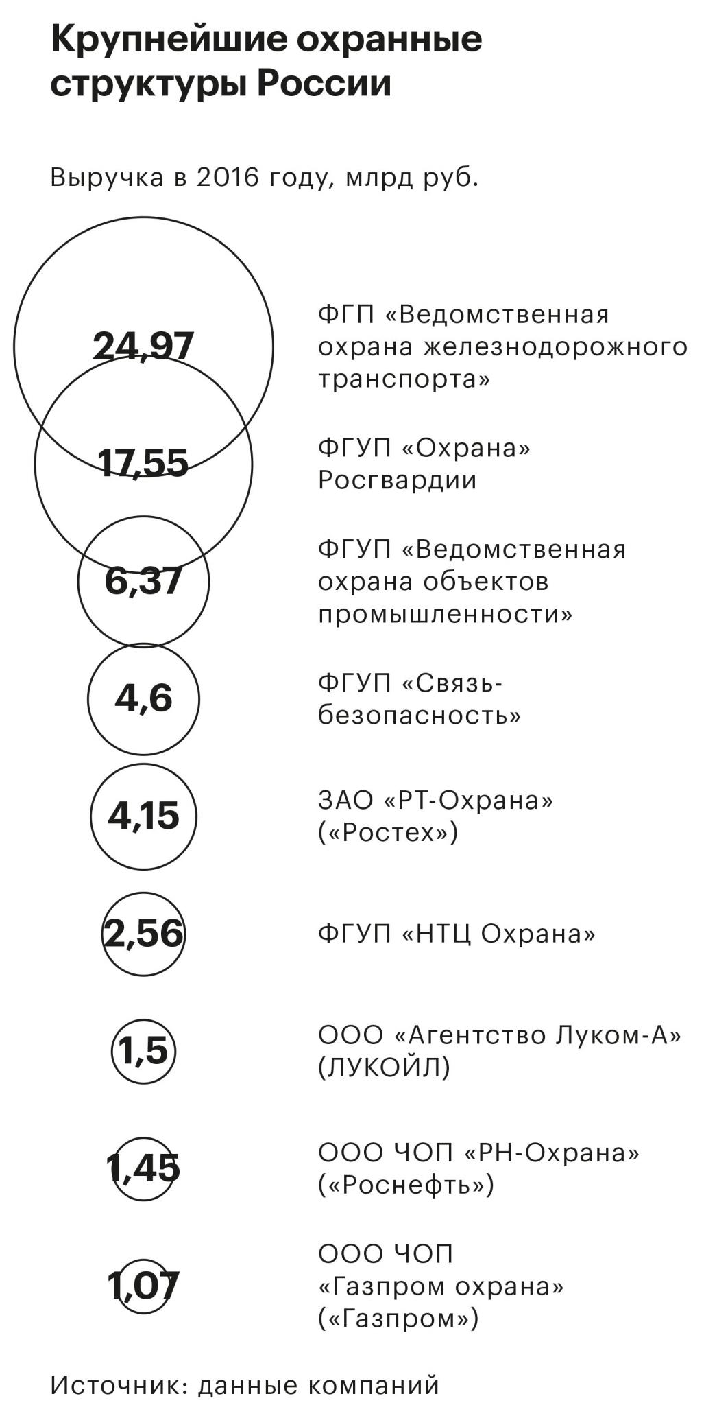 По размеру выручки «Охрана» Росгвардии пока уступает железнодорожной охране, но значительно превосходит ее по диверсификации выручки и административному ресурсу. ФГУП «Охрана» Росгвардии — это более 53 тыс. сотрудников, более 100 тыс. объектов и 80 филиалов в субъектах РФ. Сама эта структура берет начало от вневедомственной охраны при органах внутренних дел, которая была реорганизована в 2005 году во ФГУП «Охрана» МВД России. Создание в апреле 2016 года Росгвардии и перевод под ее крыло «Охраны» повлекли за собой не только переименование последней, но и более важные последствия.