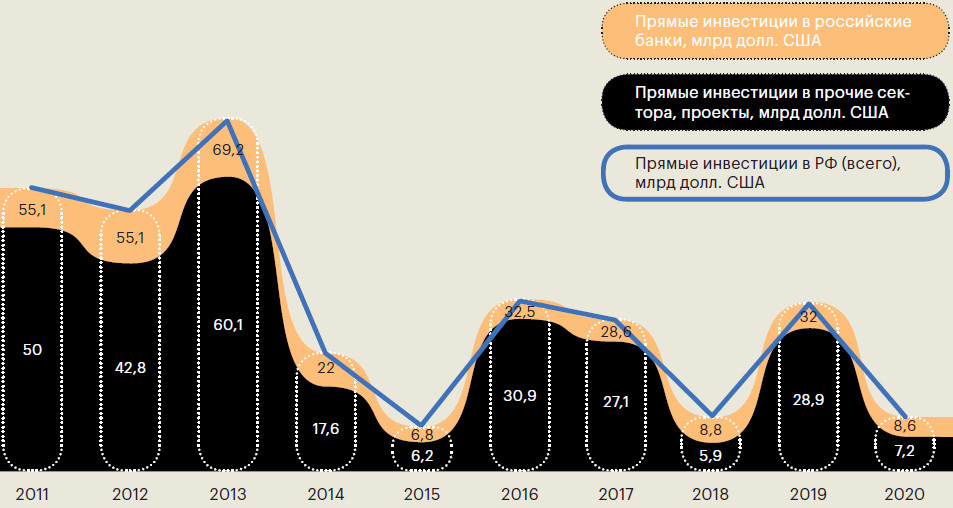 По данным Центрального банка России, объем прямых иностранных инвестиций в страну в 2018 году составил $8,8 млрд. В 2019 году — $32 млрд, а в 2020-м — $8,6 млрд.