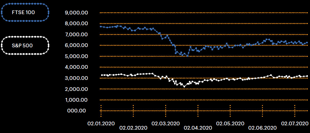Индекс S&P 500 в феврале 2020-го сильно упал, но уже в июле достиг почти докризисного уровня. FTSE 100 не показал таких темпов, но продолжает хоть и медленно, но стабильно расти.
