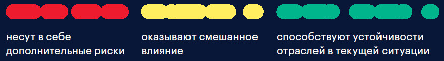 Государство в условиях санкций принимает меры поддержки значительной части отраслей, однако в других секторах продолжают действовать определенные ограничения или вводятся новые, более жесткие правила игры (например, ограничение наценки на некоторые виды товаров для розничной торговли или ограничение маржинальности для металлургических предприятий). В силу необходимости обеспечения продовольственной, энергетической безопасности и потребности населения в жилье приоритетными направлениями гос поддержки являются сельское хозяйство, электроэнергетика, жилищное строительство. В перспективе поддержка потребуется транспортной отрасли, особенно пассажирским авиаперевозкам. Вместе с тем определенными ограничителями могут выступать дефицит бюджета и необходимость длительных процедурных согласований предоставления господдержки.