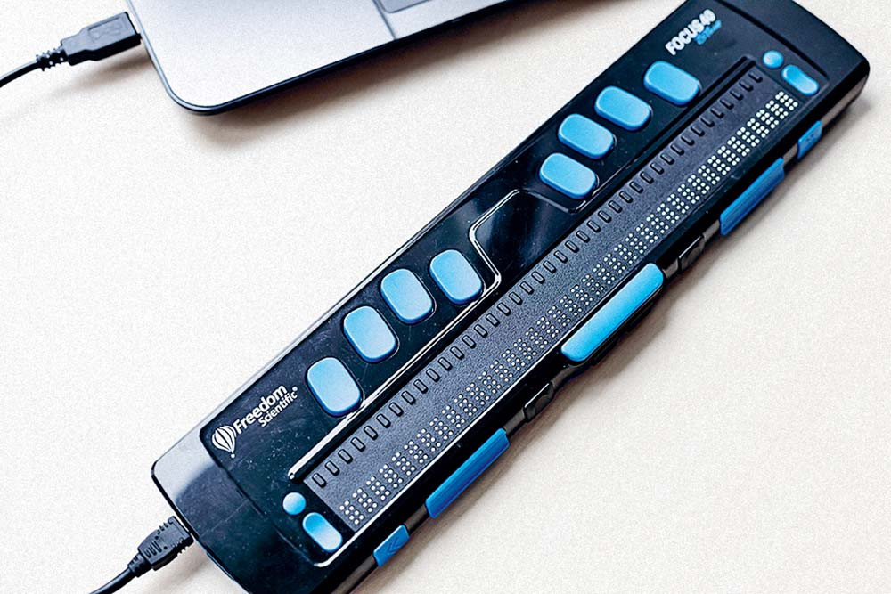 Дисплей предназначен для вывода информации с компьютера или смартфона. По габаритам он напоминает обычную клавиатуру, но вместо стандартных клавиш оборудован брайлевской строкой. Символы выступают над плоской поверхностью и меняются в зависимости от текста, который выводится. Как и обычный текст, написанный азбукой Брайля, пользователь читает его тактильно. Для работы с дисплеем необходим скринридер — именно он передает информацию на дисплей.