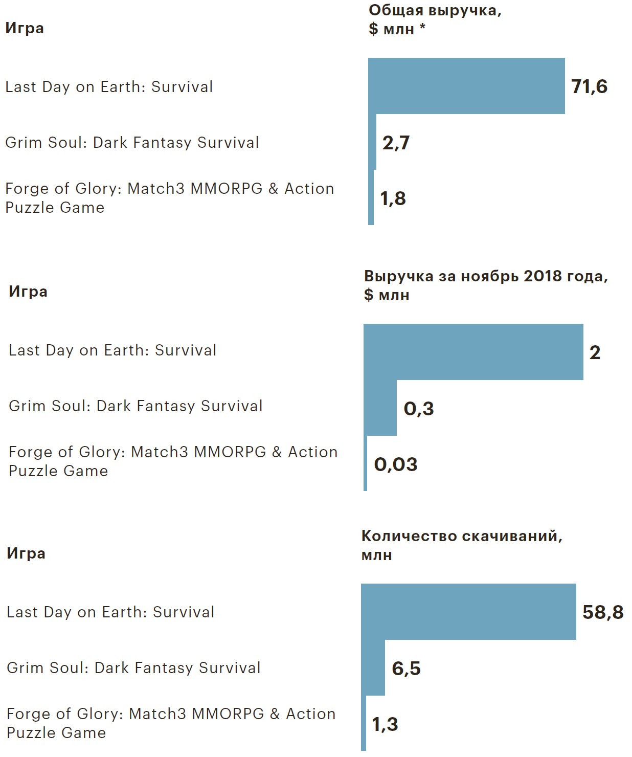 Но большой успех пришел лишь со второй мобильной игрой: Last Day on Earth, релиз которой состоялся в мае 2017 года, за полтора года с учетом доходов от рекламы принесла «Кефиру» более $150 млн. В июне 2018-го у компании появилась еще одна игра в том же жанре — Grim Soul: Survival, но побить показатели Last Day ей не удалось (см. инфографику).
