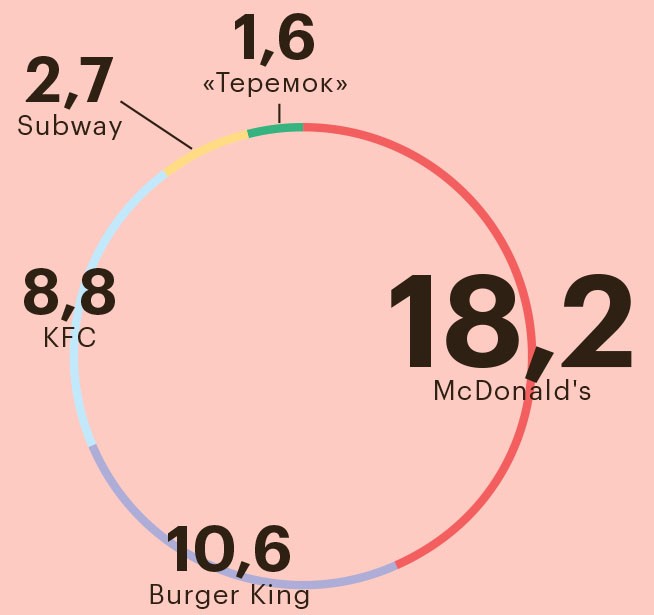 Дерзкая стратегия сработала: российский BK не первый год растет опережающими темпами и в 2017-м был признан лучшим мастер-франчайзи в мире. В 2018 году выручка сети более чем из 500 ресторанов подскочила на 35% (около 29 млрд руб.), а чистая прибыль — в девять раз (0,9 млрд руб.). По оценке Euromonitor International, у BK уже более 10% рынка фастфуда (его объем оценивается в 500 млрд руб.), отставание от McDonald’s — менее 8%.