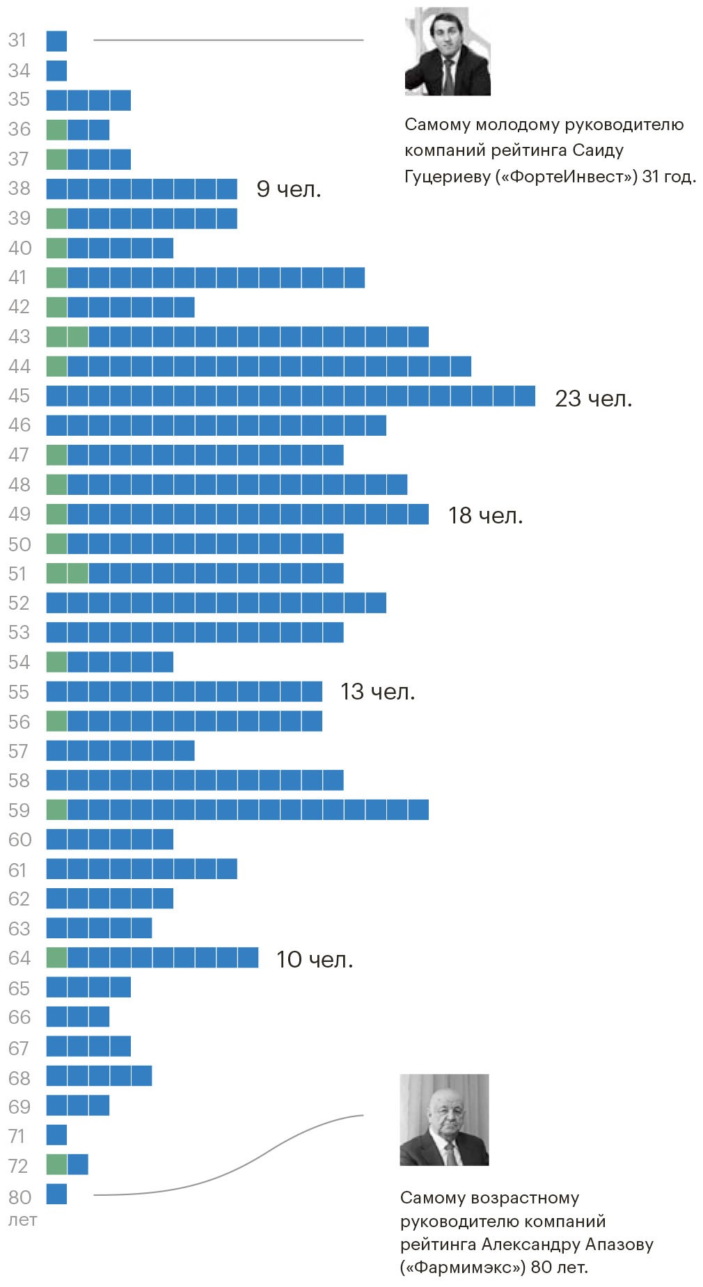 Рейтинг РБК 500 не только показывает состояние дел в российской экономике, но также помогает составить представление о капитанах отечественного бизнеса. В частности, изучив личные данные 373 руководителей компаний-участниц рейтинга, мы выяснили оптимальный возраст для успешного занятия бизнесом — 45 лет (6,2% от общего числа руководителей). При этом в возрастной диапазон от 39 лет до 51 года вошли более половины участников рейтинга.