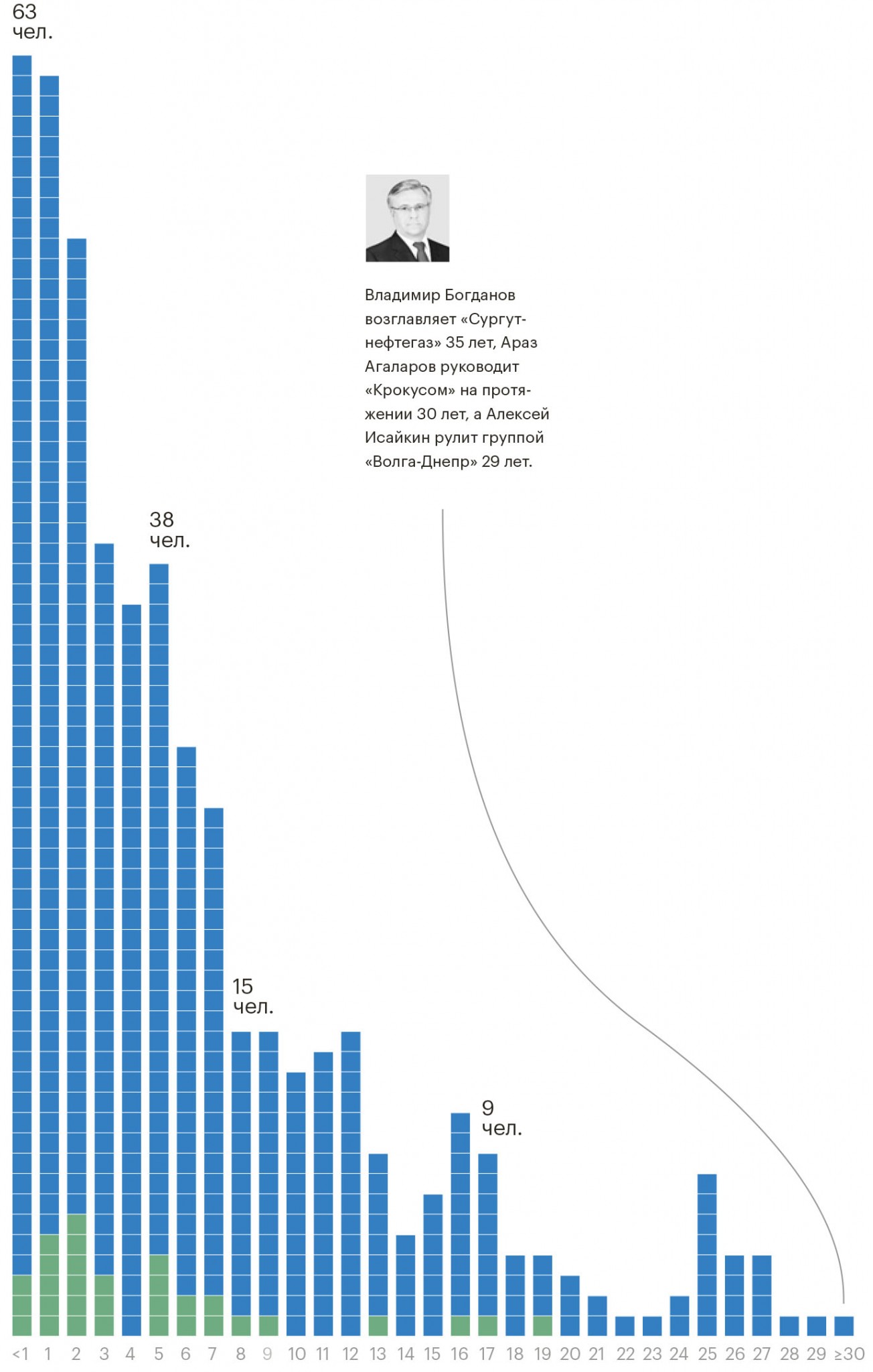 Если рассмотреть стаж руководства компаниями, а здесь мы располагаем данными по 496 участникам рейтинга, то налицо тенденция «свежей крови» — более половины руководителей возглавляют свои компании не более пяти лет. При этом в рейтинге руководителей есть и настоящие патриархи.