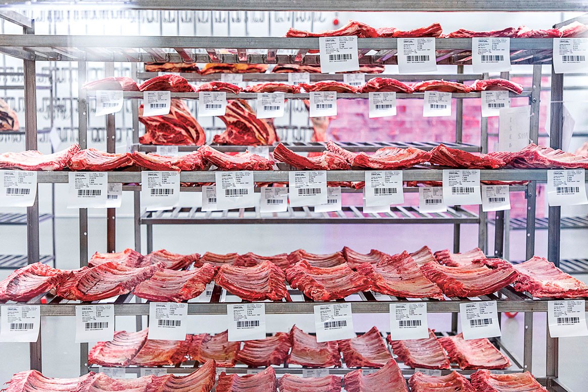 Четверть туши уходит в разделку. Непринужденно мелькают лезвия обвальщиков: ручная обвалка — это отдельное завораживающее шоу. В отдельных помещениях, куда заходит конвейер, очередью вылетают пельмени, мягко шлепаются котлеты для бургеров, ложатся на подложку прозрачные лепестки карпаччо. Из туши получается более ста различных отрубов. В общей сложности в год «Мираторг» производит 108 тыс. т говядины в убойном весе. Доля «прайма» доходит до 30%, и ему нужен сбыт.