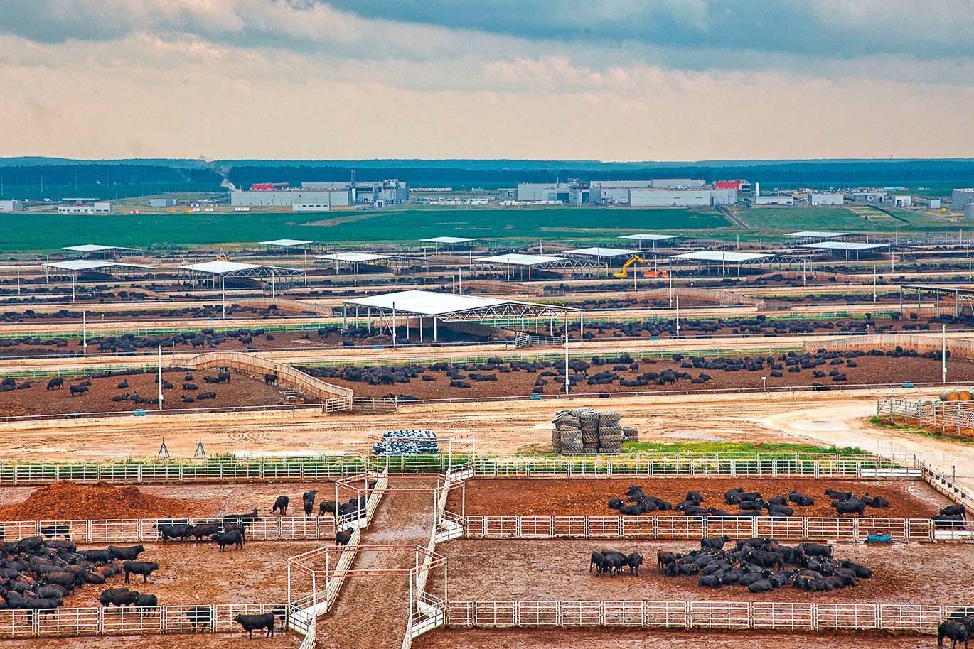 Евгений перечисляет: до полугода телята растут в поле с мамками, на подсосе. Потом идут на ферму доращивания, на зеленые корма, пока не наберут 350 кг. В 13 месяцев переводятся на фидлот: не спеша, пешком, в сопровождении ковбоев, с пастбища на пастбище. Здесь 240 дней животные содержатся в открытых загонах, постепенно, чтобы привыкал желудок, переходя с рациона на рацион. Первая диета содержит лишь 20% кукурузы, к шестой ее содержание достигает 80%.
