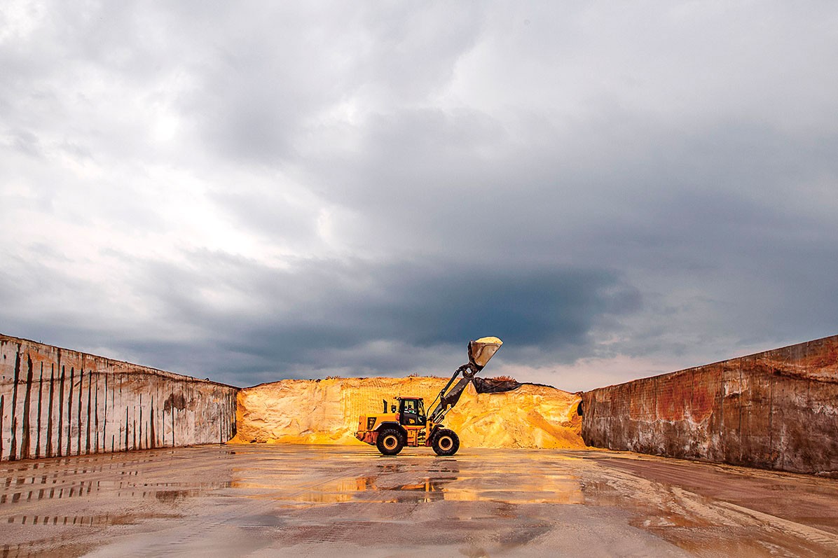 Мы беседуем с ним на площадке между огромными золотыми валами пятиметровой высоты. Эти насыпи 120 на 30 м здесь скромно называют траншеями, хотя они больше похожи на руины египетских храмов. В каждой — 20 т плющеной кукурузы: оболочку зерна пробивают, чтобы крахмал из него легко усваивался. Экскаватор откусывает от золотых гор черпак за черпаком и ссыпает в грузовик Volvo. Над погрузкой алчно кружат птицы. В год им перепадает тонна зерна, сетует Евгений, но в масштабах фидлота это усушка-утруска.