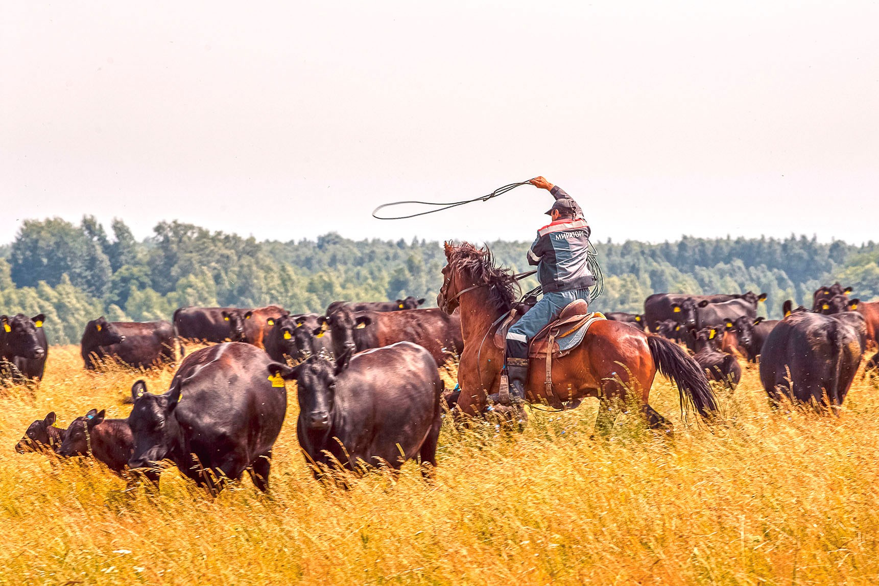 Стадо беспокойно мычит, расступается. Некоторые животные бегут — вовсе не «как коровы»: абердин-ангусы могут ускоряться до 70 км/ч. Но вот свистит веревка, и лассо захватывает одного из мощных телят. Лошадь тут же застывает, помогая всаднику натянуть веревку. Ковбой закрепляет лассо у седла, спешивается. Мать, охраняя теленка, при приближении человека отступает и пытается зайти на него со спины — корова комолая, то есть безрогая, но в ней больше полутонны веса и могучий материнский инстинкт. Лошадь, пятясь и не ослабляя натяжения лассо, перекрывает ей путь. Она явно знает, что делает, и пользуется у стада авторитетом. Ковбой склоняется над теленком. Клик! На черном ухе повисает большая ярко-желтая серьга — гипоаллергенная полиуретановая бирка. В другом ухе уже закреплен чип — электронный паспорт животного. Лассо снято, тряся головой, теленок убегает вместе с матерью.