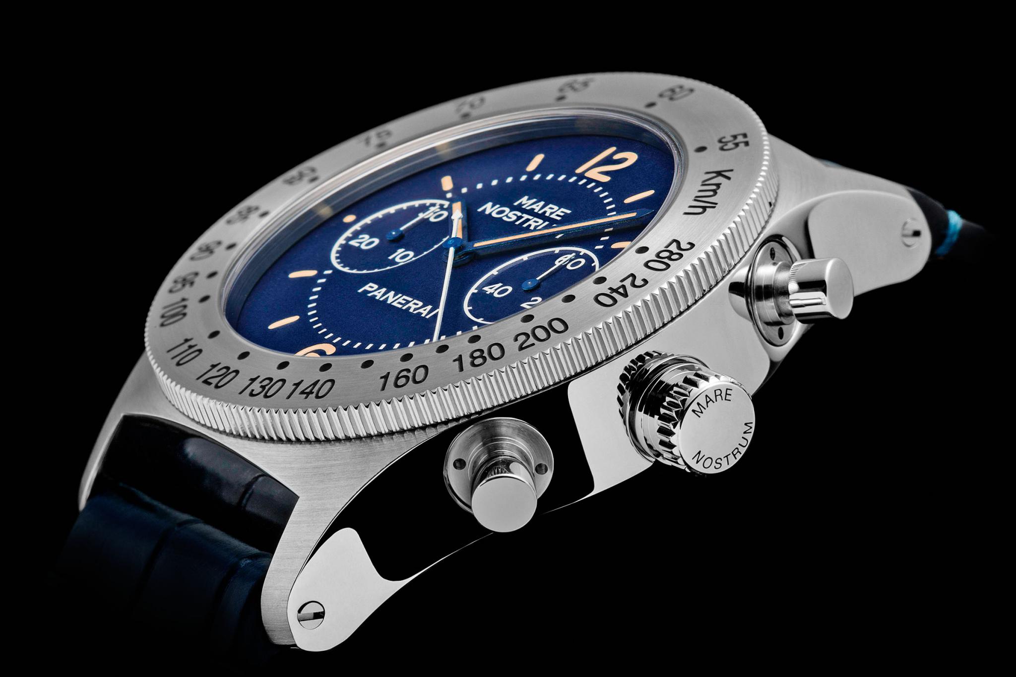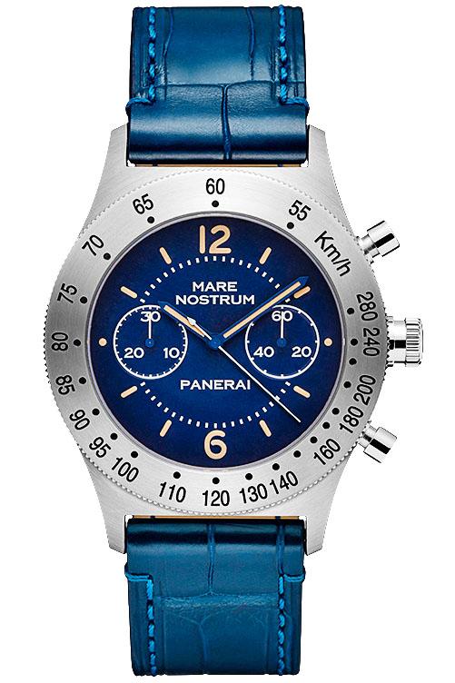 Про часы Mare Nostrum доподлинно известно не так уж немного. Прототип самого первого хронографа Officine Panerai был выпущен в 1943 году по заказу итальянского правительства и предназначался для вахтенных офицеров Королевских ВМС. Однако часы с калибром Angelus в стальном 52-миллиметровом корпусе так и не запустили в производство, и долгое время они оставались недоступным раритетом. В год 50-летия Mare Nostrum было решено перевыпустить часы в более удобном для ношения размере корпуса (42 мм), несмотря на то что инженеры Panerai не располагали полной информацией о модели-предшественнике. На стальной полированный безель нанесли тахиметрическую шкалу, а исходный болотный цвет циферблата заменили на темно-синий. Современный хронограф Mare Nostrum Acciaio 42 мм во многом повторяет модель так называемого пре-вандомского периода (1993–1997 годы): кроме «морского» оттенка циферблата в нем используется тот же механизм OP XXXIII, созданный Panerai на основе ETA 2801-2 с модулем хронографа Dubois-Depraz. Калибр с ручным заводом отмечен сертификатом COSC.