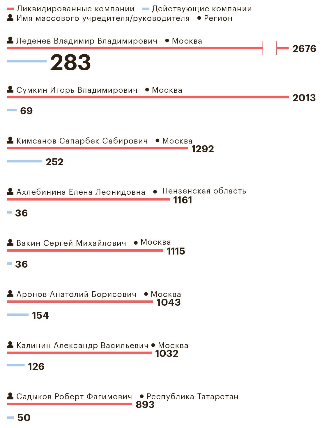 - Кол-во ликвидированных юрлиц с его участием: 300–2600