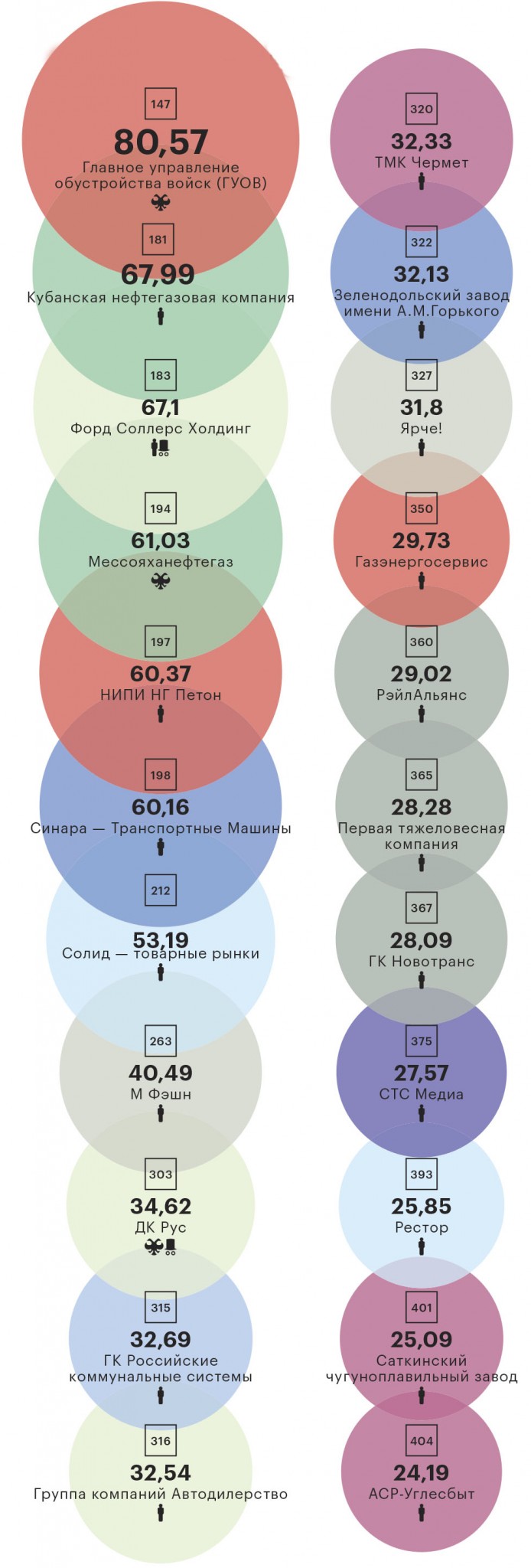 Выше всех в рейтинге новичков поднялись Главное управление обустройства войск (ГУОВ, 147-е место), крупнейший строительный холдинг Минобороны, Кубанская нефтегазовая компания (181-е место), ведущая переработку нефти на собственном НПЗ в Краснодарском крае, и вернувшийся в рейтинг «Форд Соллерс Холдинг», СП Ford и ОАО «Соллерс».